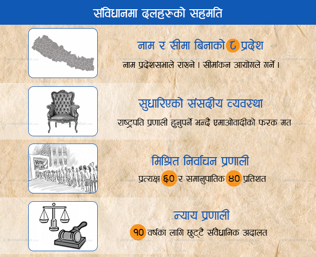 यसअघि बढिमा ६ प्रदेश भन्दै आएका कांग्रेस-एमाले ८ प्रदेश मान्न तयार भएको र सिमांकन अहिलेनै गर्नुपर्छ भन्दै आएका एमाओवादी र मधेसी मोर्चाले आयोगको सिमांकन मान्न तयार भएको अवस्थामा नयाँ सहमति हुन लागेको हो ।